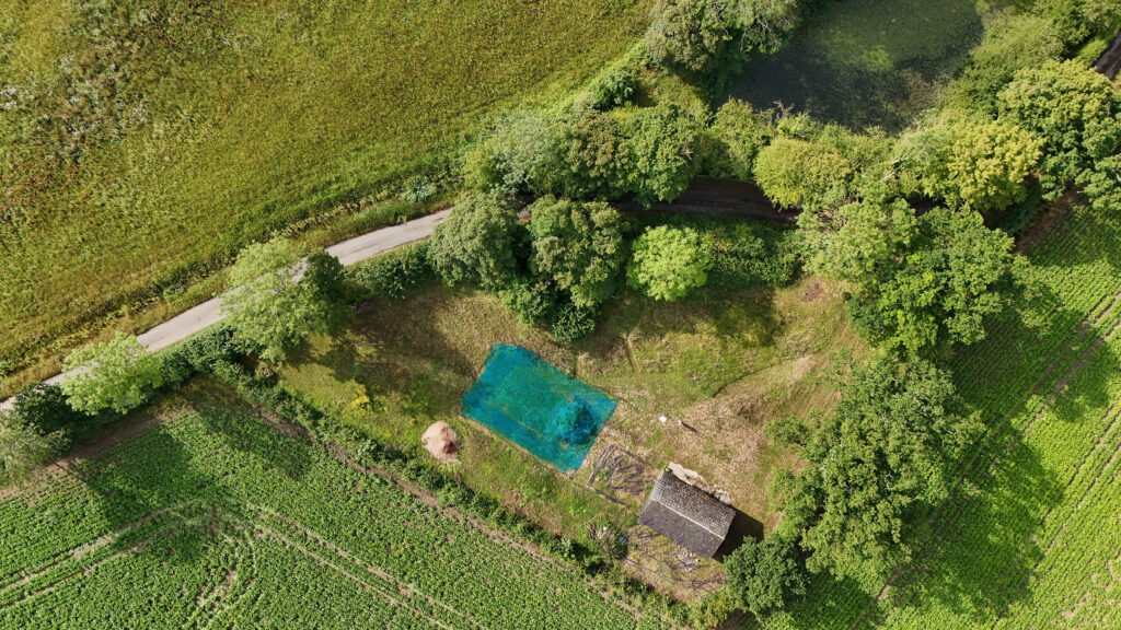 I’m ready to start overhead documenting of the (eventual) building process. First, here’s an indication of where the natural swimming pond will be placed.