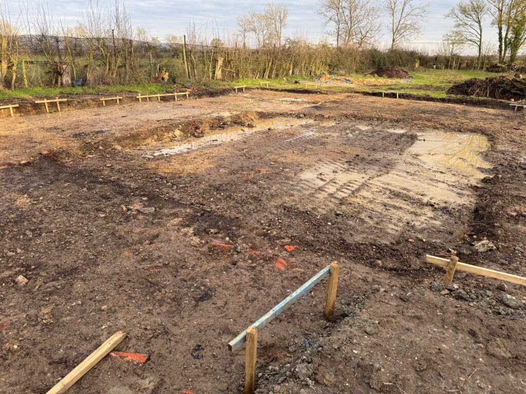 Monday 24th November 2025 was the day that work started on site. The contractors, who are local, made a driveway, with some space for parking and set up the site for another local firm, Panks, to start work on the borehole that we will need for a water supply but which the builders will also need. The contractors have also placed a couple of cabins on the site. Even with this relatively minor start, the site has a completely different feel to it. It really does look like a building site. When I visited on the Wednesday, the drillers had reached down to about 20 meters. I say drillers but the hole is made purely by percussion. They drop down a heavy hollow tube with a trap door on the bottom which allows them to repeatedly pull it up, empty it and repeat. As they go down they line the deepening hole with slightly larger metal tubing and keep screwing on a further piece as this lining drops further down. Once complete they retrieve this lining having sunk what looks like blue pvc piping down to the bottom of the hole they have made. They are in clay at the moment, which is full of water, and aim to reach sand and chalk where the reliable water supply is to be found. In the video you can see the process and the small stone walls they have fashioned to contain the water and silt that they are bringing up. They say it will take two weeks for this part of the borehole to be finished and all the machinery cleared away. Once they have established a supply they pump it out (into a ditch) for up to 48 hours to encourage a flow and for the water to run clear. They will leave a rudimentary water supply for the builders to put to non-potable use. When the house is built Panks will return to install the filtration system that is needed to be able to use the water for drinking. It still seems unbelievable that this is all possible but I suppose humans have been doing this for centuries.